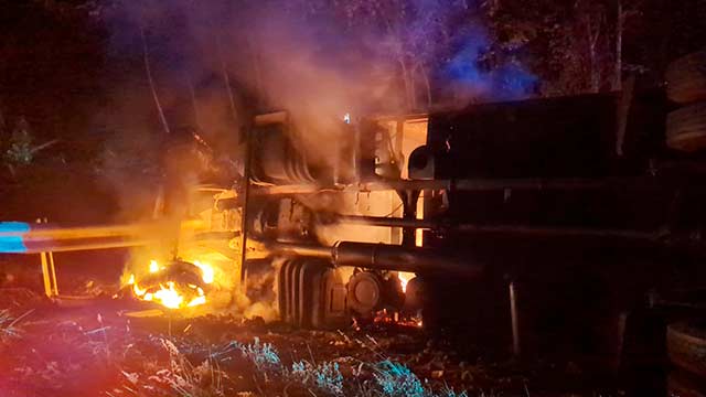 Alto Lucero, Ver., 27 de enero de 2026.- La noche de este martes, un tráiler volcó y se incendió sobre la autopista federal Cardel-Poza Rica, a la altura de Ojo de Agua. Integrantes de la Comisión Nacional de Emergencia y Bomberos Voluntarios Palma Sola ayudaron a sofocar el incendio; no hay reporte de lesionados. Por el momento no hay paso.