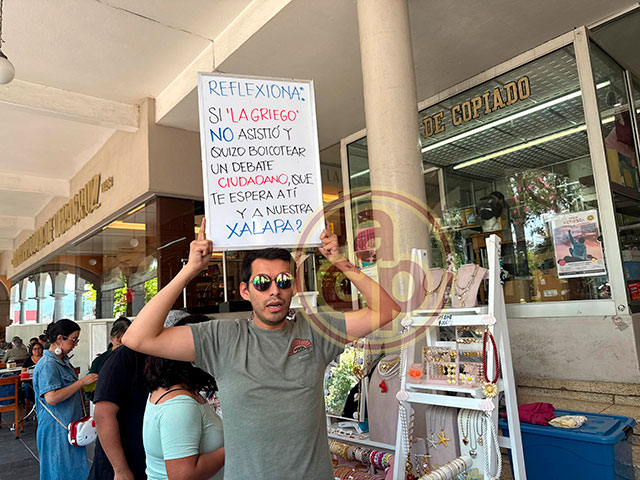 Xalapa, Ver., 13 de mayo de 2025.- Ciudadano insta a la población a que cuestione a candidatos y razone su voto este 1° de junio. En la zona centro portó un letrero que resalta la inasistencia de una contendiente a un debate ciudadano.