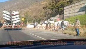 La mañana de este martes se registró la volcadura de un tráiler cargado con maíz a granel en la autopista 150-D, a pocos metros de la laguna de Nogales, con dirección a Puebla. Tras el percance, personas llegaro al lugar a robar el cargamento.
