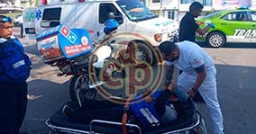 Xalapa, Ver., 3 de diciembre de 2025.- Taxi y una mujer repartidora de pizzas que iba en moto chocaron en la avenida Maestros Veracruzanos, esquina con Adalberto Tejada, en el fraccionamiento Pomona. Paramédicos atendieron a la lesionada, mientras que personal de Tránsito del Estado hizo el peritaje. |
