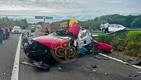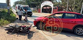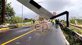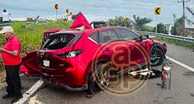 Puente Nacional, Ver., 13 de enero de 2026.- Dos mujeres y sus mascotas resultaron lesionadas luego de que el contenedor de un tráiler impactara y destrozara una camioneta Mazda. Al lugar acudieron elementos de Tránsito Estatal y Guardia Nacional. Las heridas fueron trasladadas a un hospital del IMSS en Cardel. |