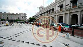 Xalapa, Ver., 25 de marzo de 2026.- Como parte de los trabajos de remodelación de la Plaza Lerdo, instalan nuevo piso y bolardos. |