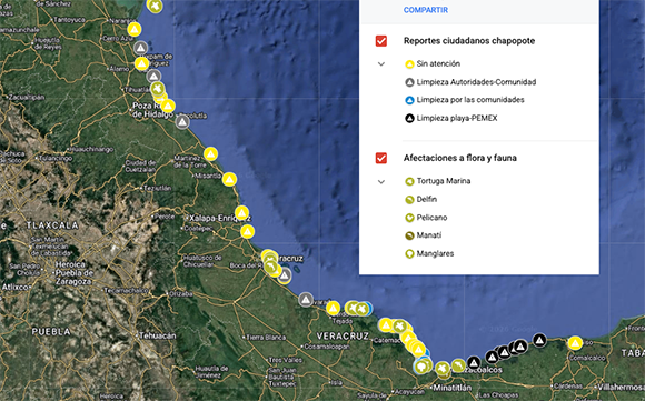 El mapa interactivo difundido por el grupo “Corredor Arrecifal del Golfo de México” exhibe afectaciones por chapopote en todo el litoral veracruzano. Los puntos amarillos son zonas sin atención, los grises zonas donde limpian autoridades y comunidad, los azules donde sólo limpian comunidades y los negros las playas donde limpia PEMEX. |