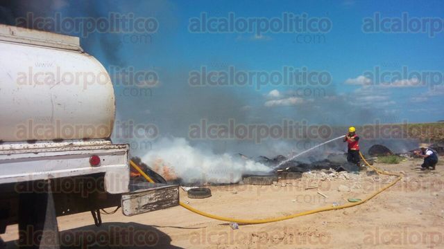 Coatzacoalcos, Ver., 3 de agosto de 2015.- Personal de PC y Bomberos llegaron al tiradero de llantas y escombros clandestino sobre la carretera Coatzacoalcos-Minatitlán, para sofocar el fuego que se reavivó desde la tarde del domingo.