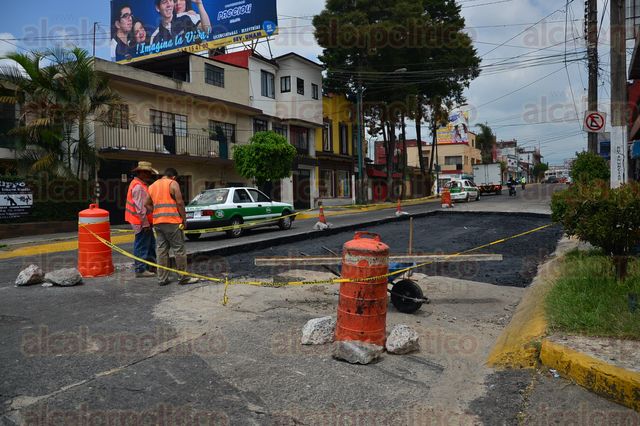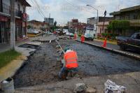 Xalapa Ver., 3 de julio de 2015.- Personal de Obras Públicas repavimenta varios tramos de la avenida 20 de Noviembre, a la altura de la iglesia “Cruz de la Misión”.