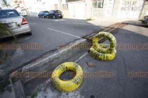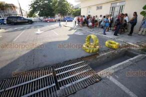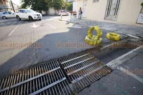 Veracruz, Ver., 2 de septiembre de 2018.- Sobre la calle Abasolo, entre el bulevar Manuel Ávila Camacho y Xicoténcatl, hay un tragatormentas sin reja; pone en peligro a los automovilistas. Por aquí circulan camiones turísticos que apenas y libran el paso. El desperfecto lleva varios meses.