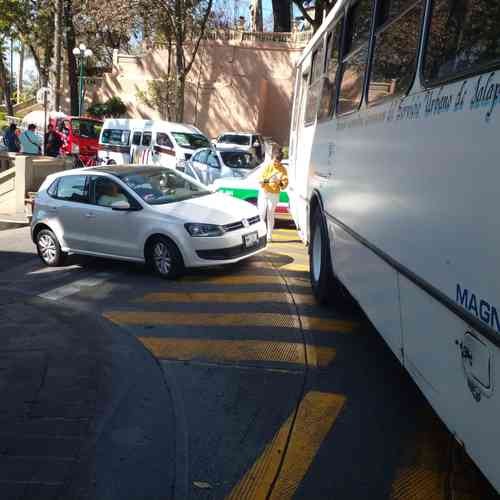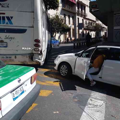 Colisionan autobús y auto en el Centro de Xalapa