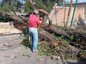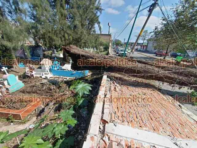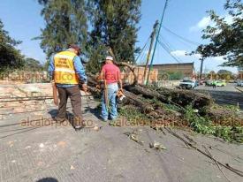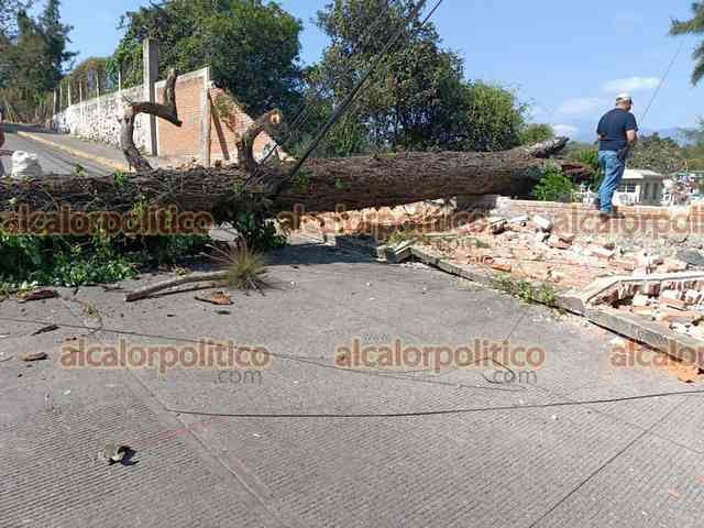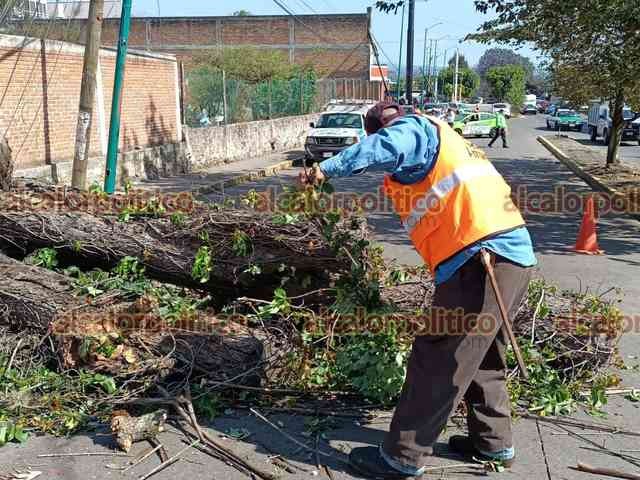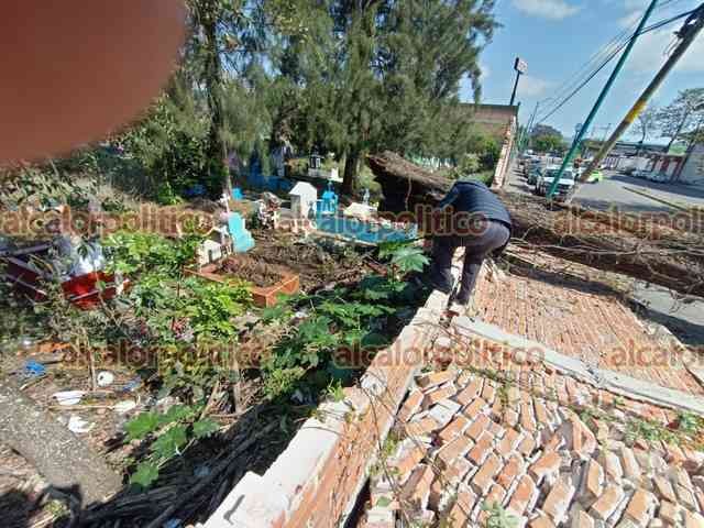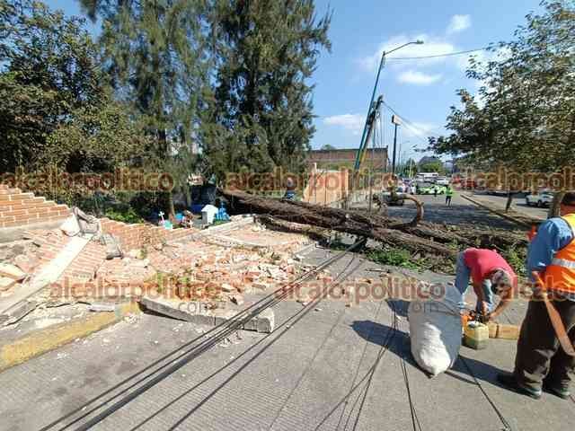 Xalapa, Ver., 21 de marzo de 2023.- Árbol que se ubicaba en el Panteón Xalapeño cayó hacia la calle Gildardo Avilés y derribó barda perimetral y postes. Personal de Medio Ambiente acudió para retirarlo; la circulación vehicular se cerró para facilitar los trabajos.