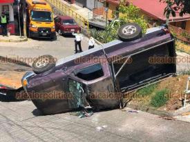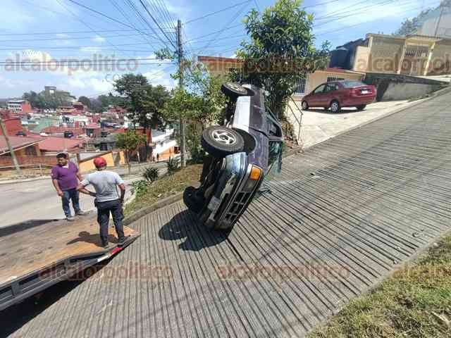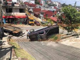 Vuelca camioneta sin control en calle con pendiente pronunciada, en Xalapa