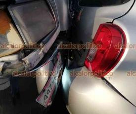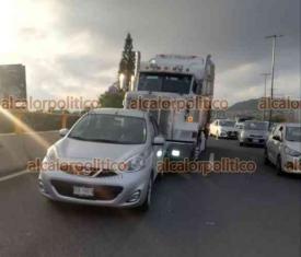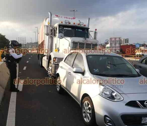 Xalapa, Ver., 23 de marzo de 2023.- Tráiler choca por alcance contra Nissan March cuando circulaban sobre la avenida Lázaro Cárdenas, cerca del puente Bicentenario; conductora del auto compacto refirió que trailero quiso huir pero fue Intervenido por Policía Vial. No hubo lesionados.