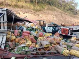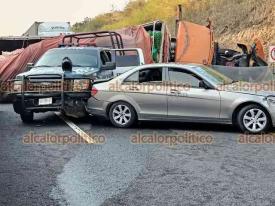 Xalapa, Ver., 24 de marzo de 2023.- Un camión de carga volcó cuando circulaba sobre el libramiento de Xalapa, a unos metros del puente de Chiltoyac. Derivado del accidente, la unidad de carga golpeó a una patrulla de la Fuerza Civil y un vehículo Mercedes Benz, una persona resultó lesionada en dicho percance.