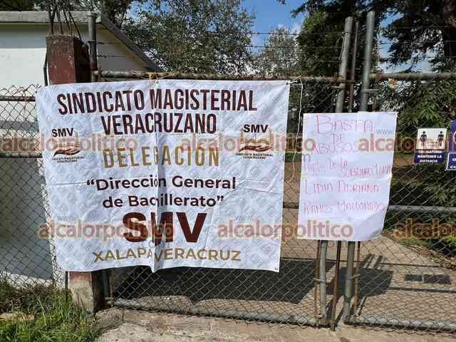 Xalapa, Ver., 25 de mayo de 2023.- Integrantes del Sindicato Magisterial Veracruzano “tomaron” la Escuela Secundaria Experimental. Acusan de abuso y hostigamiento a la Subdirectora del plantel.