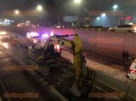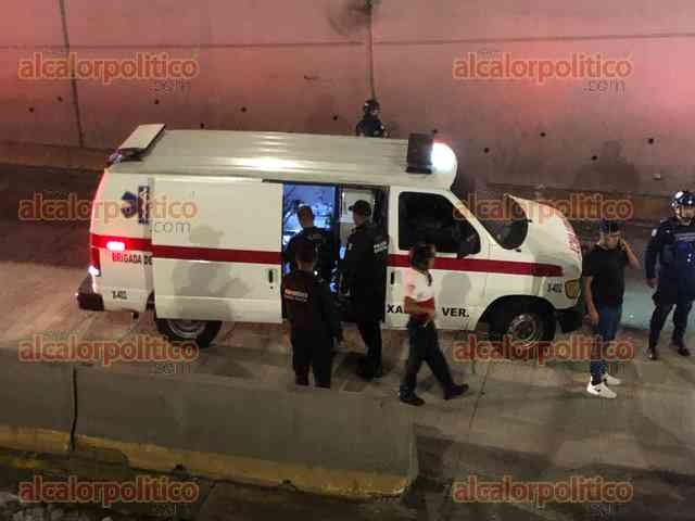 Xalapa, Ver., 25 de mayo de 2023.- La noche de este jueves un autobús del Servicio Urbano de Pasajeros volcó al perder el control cuando circulaba bajo el puente de La Araucaria, sólo se reportaron personas con lesiones leves.