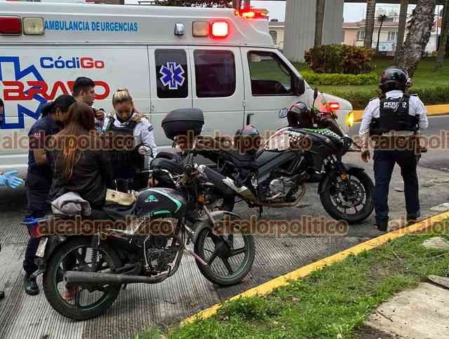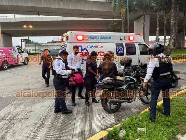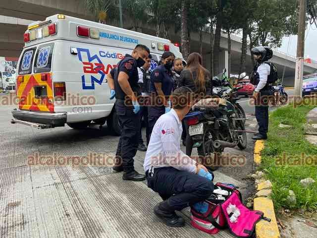 Xalapa, Ver., 26 de mayo de 2023.- Un elemento de la Policía Vial chocó contra unas jóvenes cuando ambas viajaban en motocicleta, esto en la esquina de Lázaro Cárdenas y Américas. Paramédicos de Código Bravo atendieron a la joven sin que fuera necesario trasladarla a un hospital.