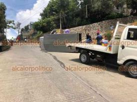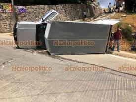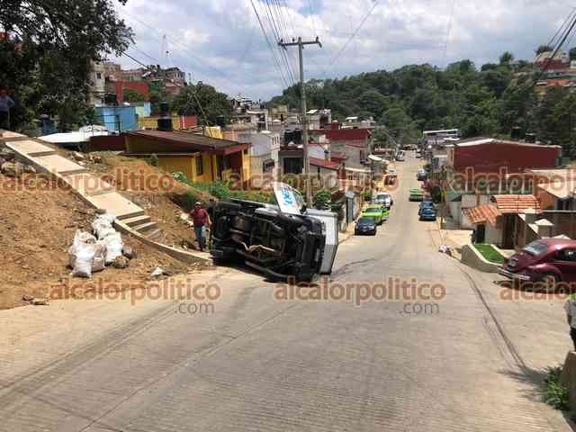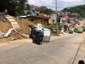 Xalapa, Ver., 27 de mayo de 2023.- Camioneta que transportaba pintura terminó volcada después de que su conductor perdiera el control al subir la pendiente de la calle Armando Ramírez colonia Ferrer Guardia. No hubo lesionados.