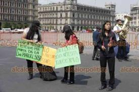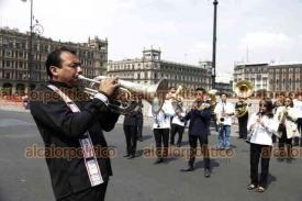 Ciudad de México, 29 de mayo de 2023.- En el Zócalo, frente a Palacio Nacional, una banda de viento de Tlaxiaco, Oaxaca; colonos de villas de Oriente en Comalcalco, Tabasco, y un colectivo de víctimas de desaparición forzada exigen ayuda al Presidente para sus respectivos casos.