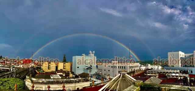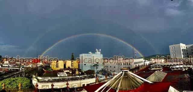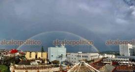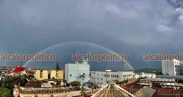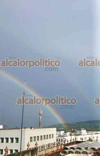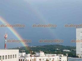 Xalapa, Ver., 29 de mayo de 2023.- La combinación de un día soleado con lluvia, dio las condiciones para un arcoíris doble en Xalapa.