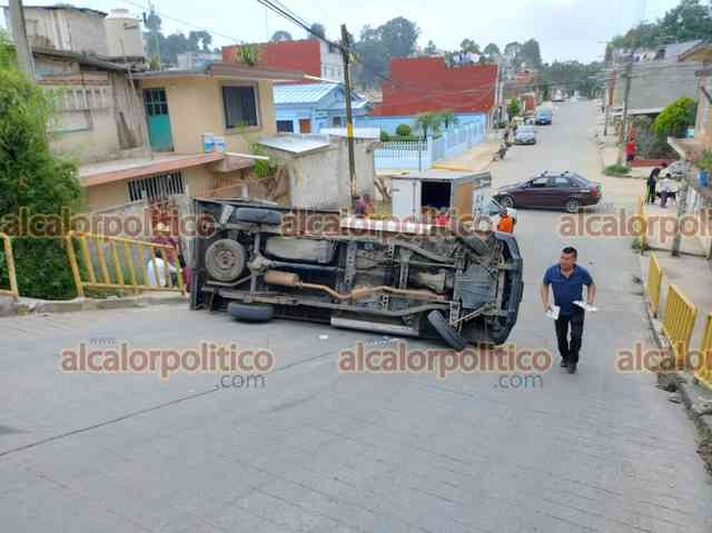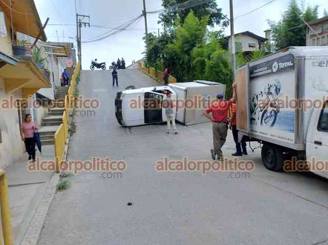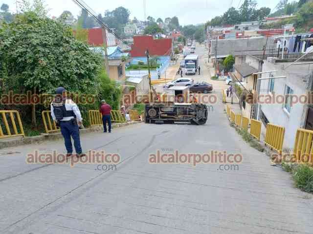 Xalapa, Ver., 2 de junio de 2023.- Una camioneta Nissan terminó por volcar cuando pretendía subir la pendiente de la calle Maderas, colonia Veracruz. Peritos de la Policía Vial acudieron para hacerse cargo del accidente en el que no hubo lesionados.