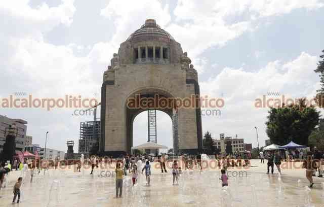 Ciudad de México, 3 de junio de 2023.- Visitantes al monumento a la Revolución aprovechan las fuentes bailarinas para refrescarse por la ola de calor que afecta la ciudad con 30°C.