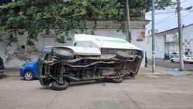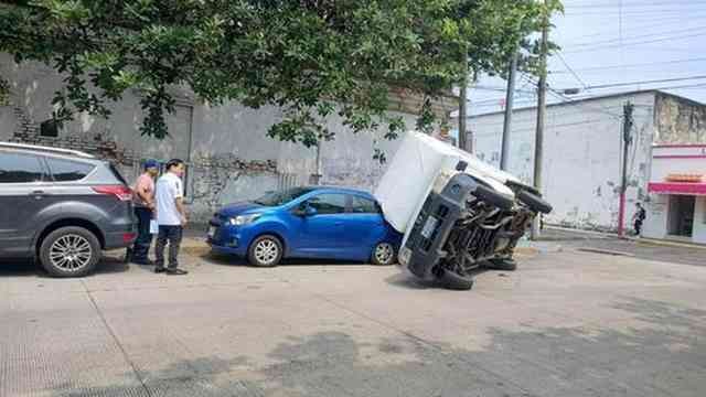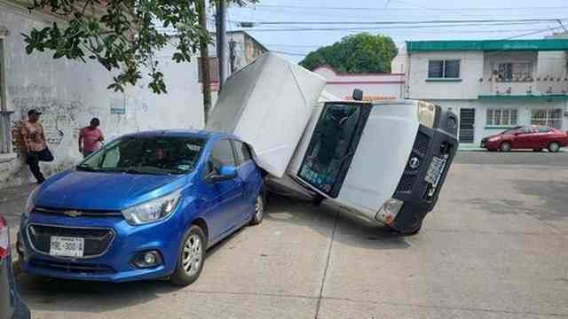 Vuelca camioneta y cae encima de automóvil estacionado, en Veracruz Puerto