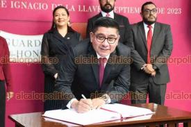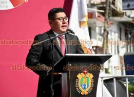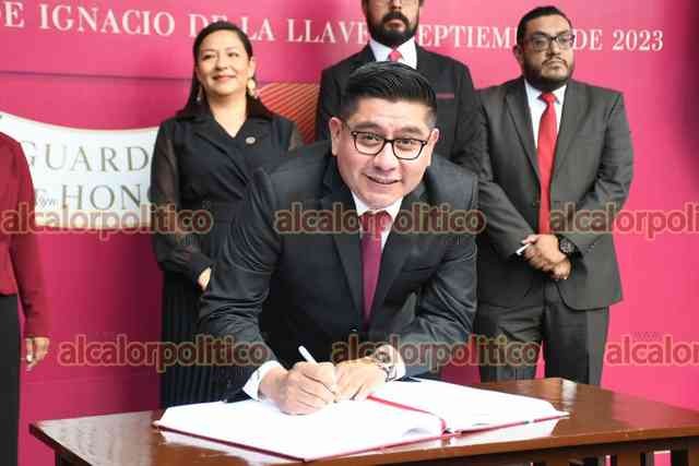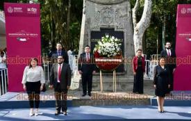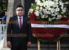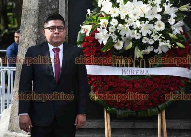 Xalapa, Ver., 25 de septiembre de 2023.- El dirigente estatal de MORENA, Esteban Ramírez Zepeta, e integrantes del comité directivo rindieron guardia de honor ante el monumento de Miguel Hidalgo, en el Parque de Los Berros.