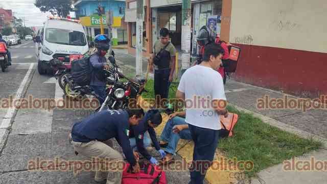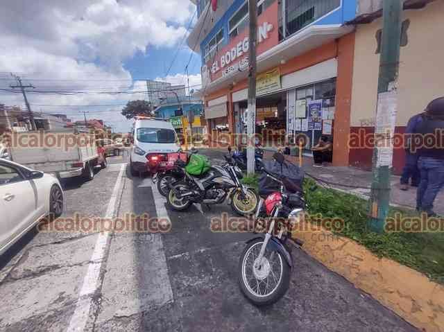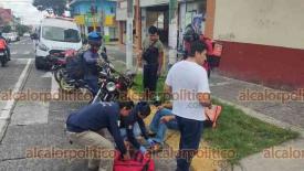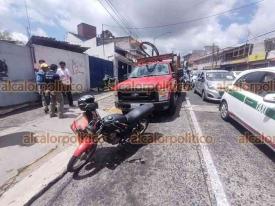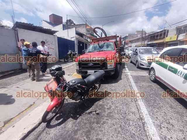Xalapa, Ver., 26 de septiembre de 2023.- Camioneta que transportaba materiales para la construcción chocó por alcance contra motocicleta, en la avenida 20 de Noviembre esquina Pípila; el tripulante fue llevado a hospital por paramédicos de PC.