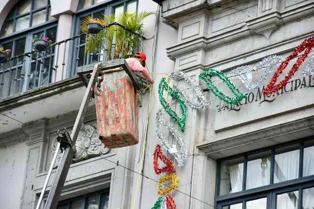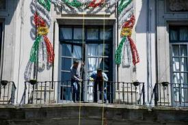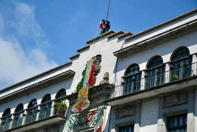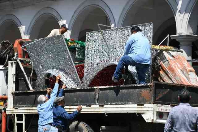 Xalapa, Ver., 1 de octubre de 2023.- Comienzan a retirar los adornos patrios de Palacio Municipal y del parque Juárez.