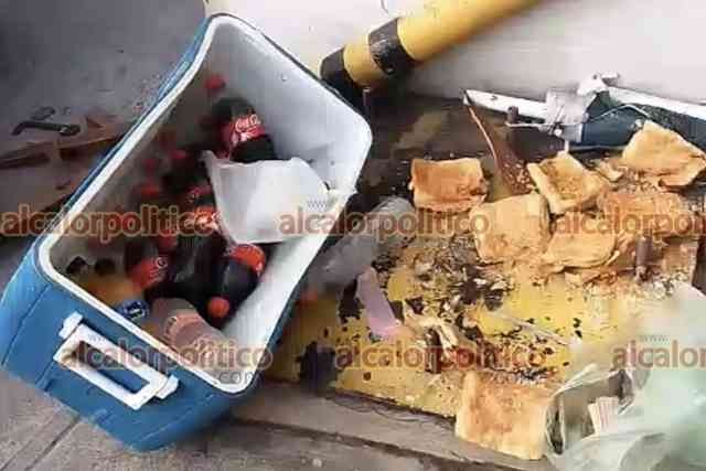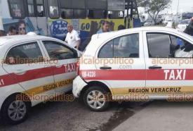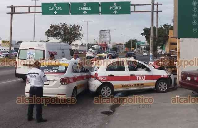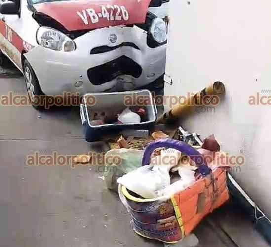 Veracruz, Ver., 28 de noviembre de 2023.- Dos taxistas chocaron cuando uno de ellos intentó incorporarse a la avenida Rafael Cuervo. La unidad 4226 fue proyectada contra un muro de contención donde se encontraba un volovanero que resultó ileso pero cuyo producto terminó en el suelo.