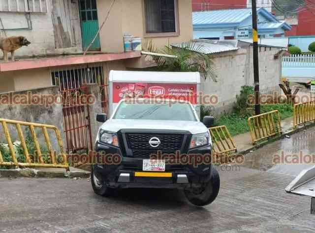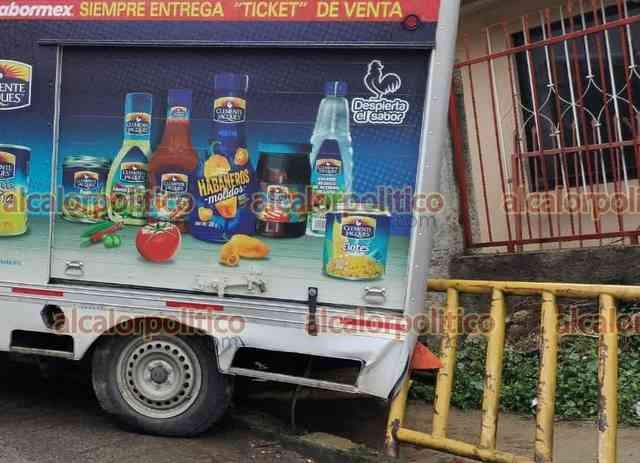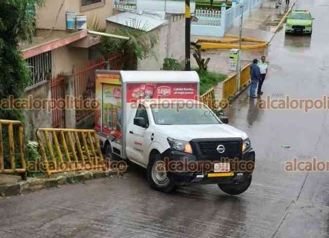 Xalapa, Ver., 29 de noviembre de 2023.- Camioneta que transportaba abarrotes se fue en reversa al intentar subir la pendiente de la calle Aguas de Xalapa, colonia Veracruz. Detuvo su marcha al chocar contra estructura metálica y no hubo lesionados. En repetidas ocasiones se han registrado accidentes en el mismo punto.