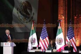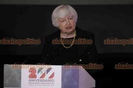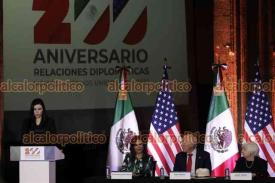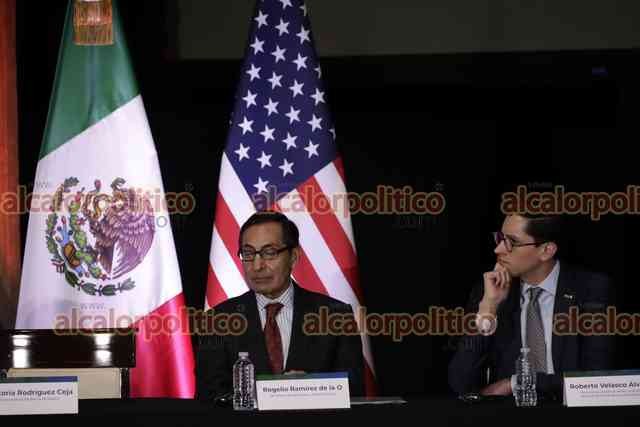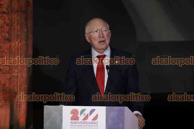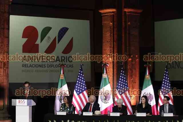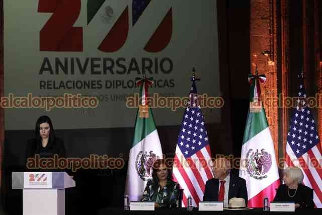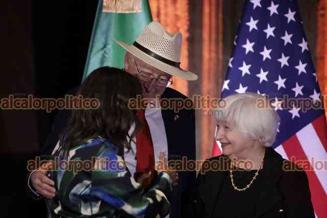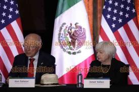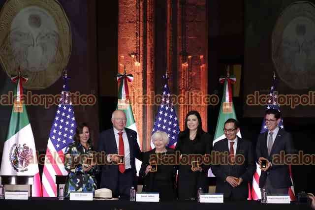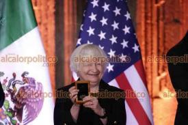 Ciudad de México, 6 de diciembre de 2023.- El secretario de Hacienda, Rogelio Ramírez de la O, y la gobernadora de Banxico, Victoria Rodríguez, entregaron una moneda conmemorativa por los 200 años de relaciones diplomáticas México-EU a la secretaria del Tesoro de aquel país, Janet Yellen y al embajador Ken Salazar.