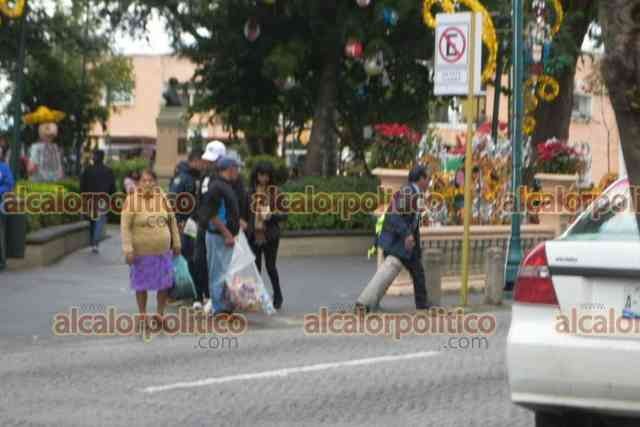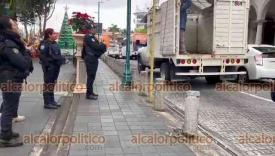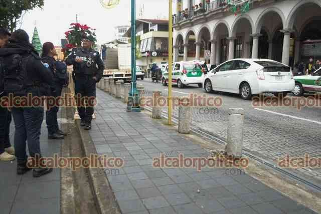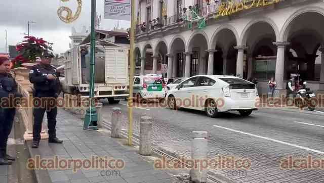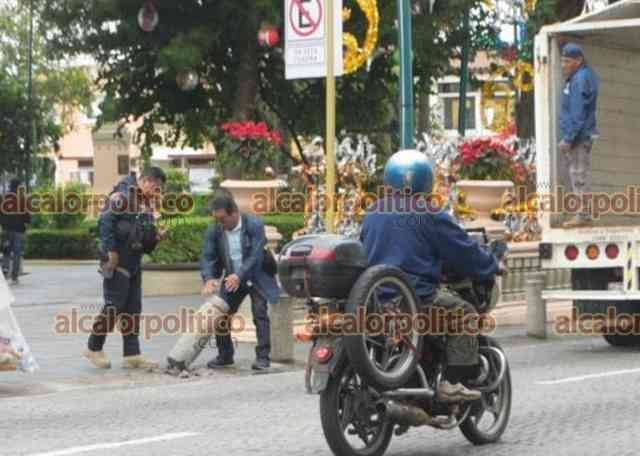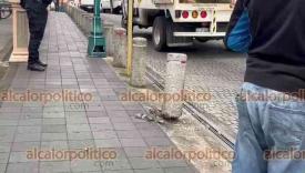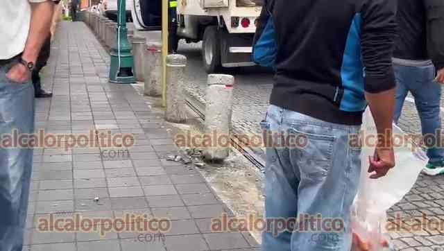Xalapa, Ver., 7 de diciembre de 2023.- Justo frente a policías estatales, camioneta derribó un bolardo del parque Juárez. Los responsables sólo pararon la estructura y se fueron sin que los elementos de seguridad hicieran más.