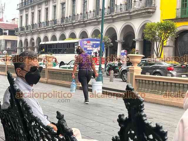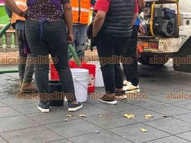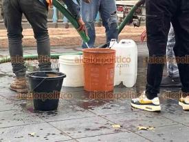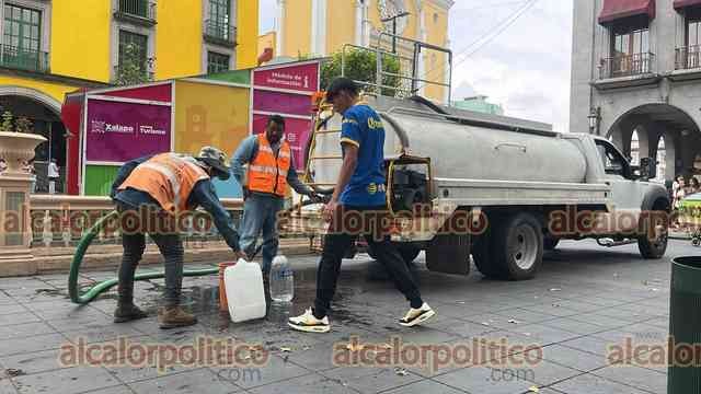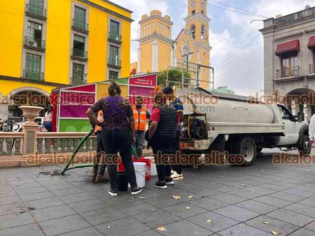 Xalapa, Ver., 29 de febrero de 2024.- Locatarios del parque Juárez se surten de agua con una pipa.