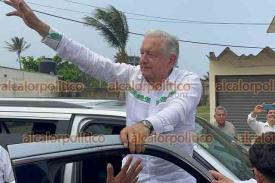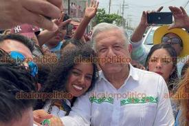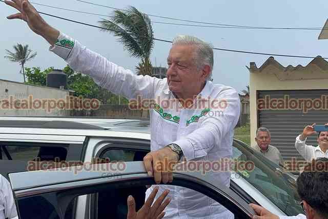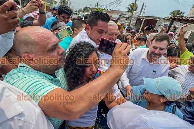 Antón Lizardo, Ver., 21 de abril de 2024. El presidente Andrés Manuel López Obrador, caminó con los ciudadanos, previo a su llegada a la Heroica Escuela Naval Militar para conmemorar el 110 aniversario de la defensa del Puerto de Veracruz. Encabezados por la agente municipal Lizeth Cárdenas, agradecieron la visita del Presidente.