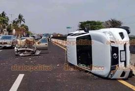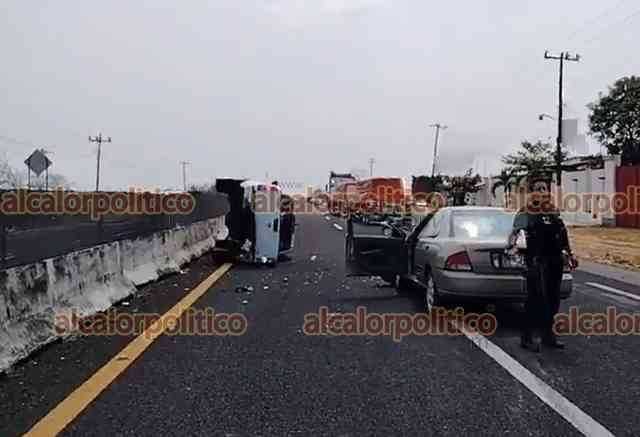 Puente Nacional, Ver., 18 de mayo de 2024.- Camioneta Frontier volcó tras ser impactada por alcance por auto Nissan, en la autopista Xalapa-Cardel, a la altura de Chichicaxtle. Familia xalapeña que iba en el vehículo volcado resultó con lesiones menores.