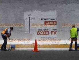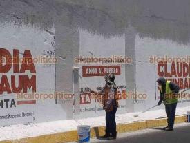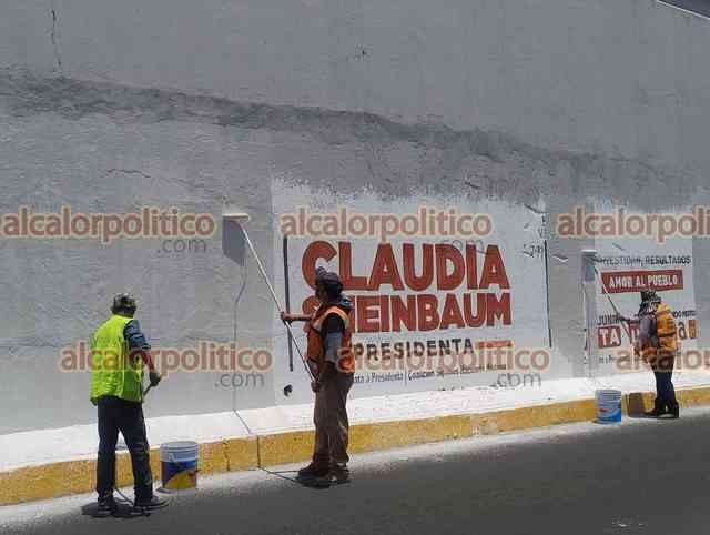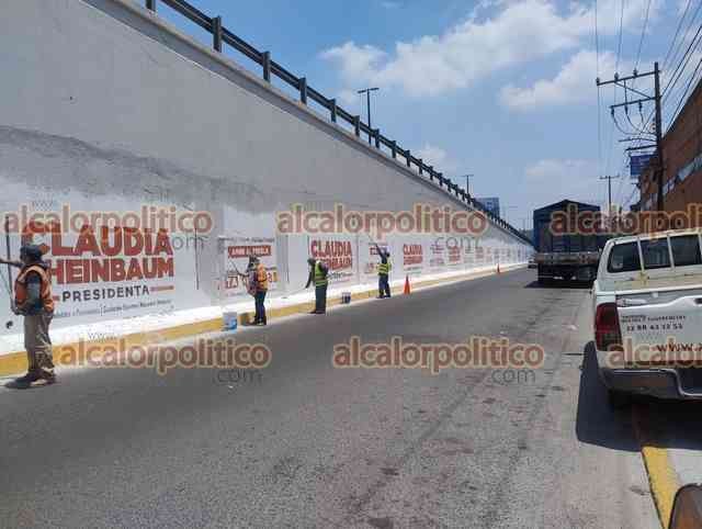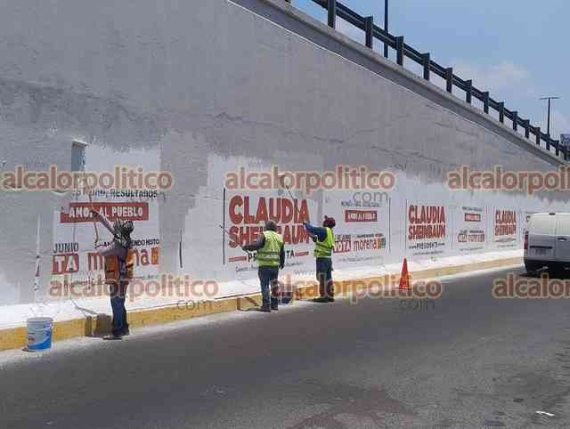 Xalapa, Ver., 20 de mayo de 2024.- En el puente Macuiltépetl, personal de Obras Públicas comenzó a remover los anuncios en favor de Claudia Sheinbaum.