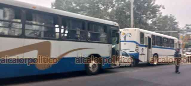 Xalapa, Ver., 21 de mayo de 2024.- Un vehículo compacto chocó contra la parte trasera de un camión de la línea ATB sobre el bulevar Xalapa-Banderilla, en ese momento otro camión chocó también contra el vehículo compacto, pese a lo aparatoso del percance no hubo personas lesionadas.