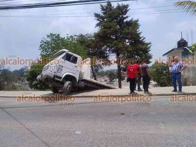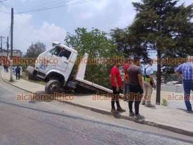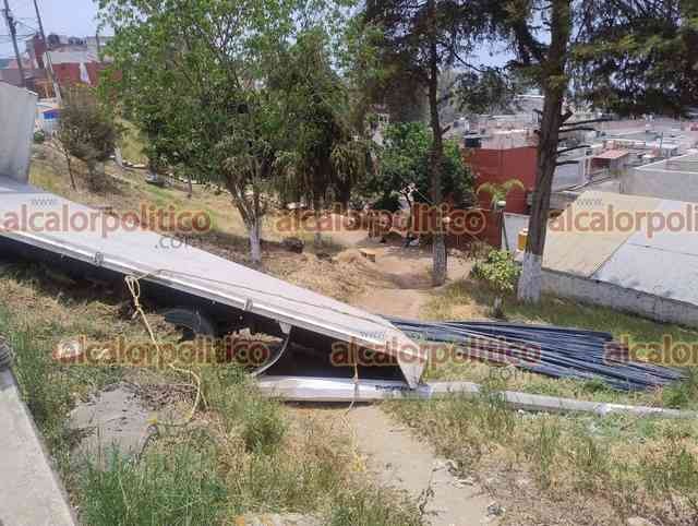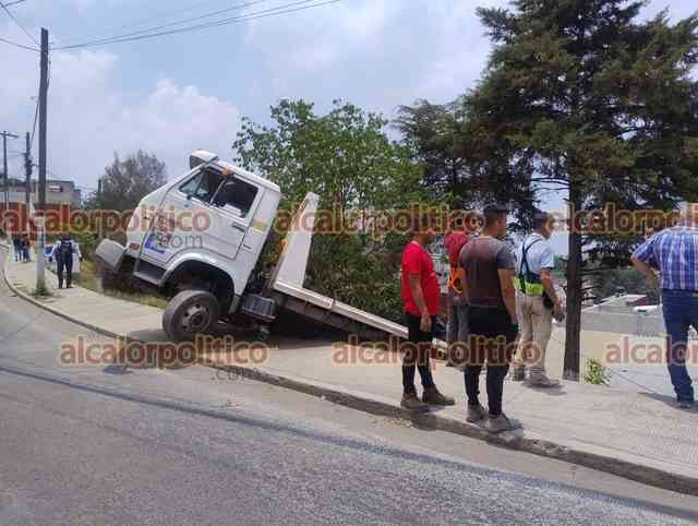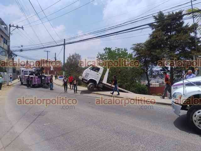 Xalapa, Ver., 29 de mayo de 2024.- En el Camino al Sumidero, colonia El Peñascal, camión que descargaba material de construcción se fue de reversa presuntamente por una falla mecánica, derribó poste de CFE y terminó fuera del camino, a punto de caer a una pendiente.