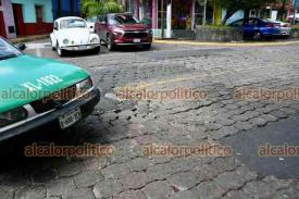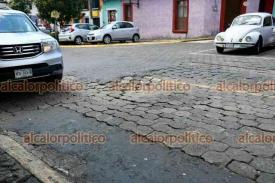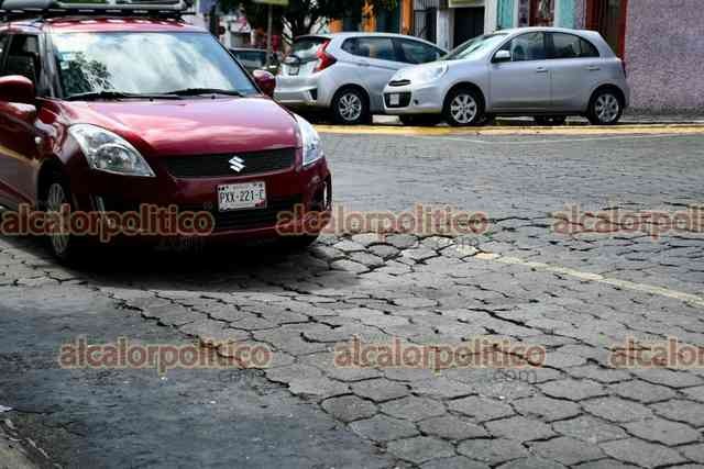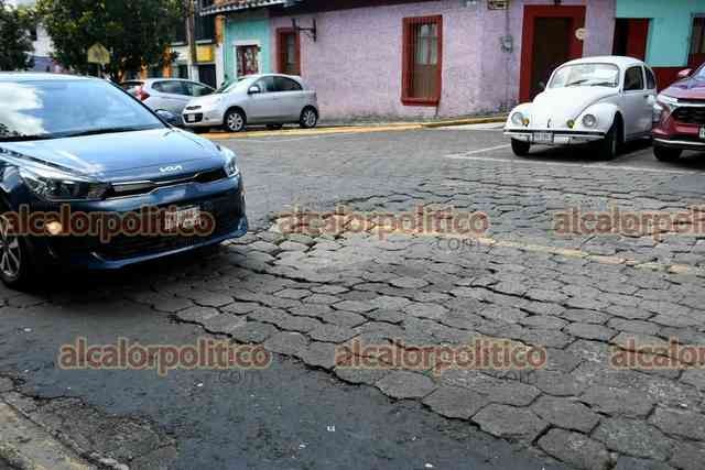Xalapa, Ver., 3 de noviembre de 2024.- Automovilistas que circulan sobre la calle Diego Leño tienen que hacer maniobras para poder avanzar sobre el carril contrario, debido al hundimiento de adoquín en esta zona.