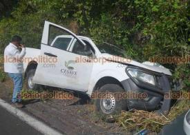 Emiliano Zapata, Ver., 11 de noviembre de 2024.- Camioneta del Comité Estatal de Sanidad Vegetal de Veracruz (CESAVE) se salió del camino tras perder el chofer el control del vehículo, en la carretera Xalapa-Veracruz, a la altura de Cerro Gordo. No hubo lesionados.