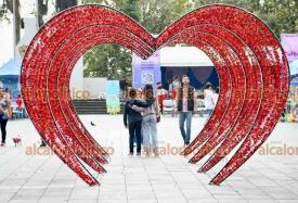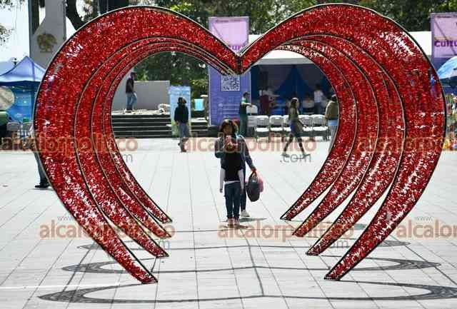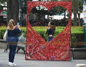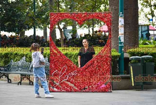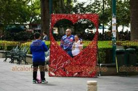 Xalapa, Ver., 9 de febrero de 2025.- Xalapeños aprovechan los corazones instalados por el Ayuntamiento en el Parque Juárez, con motivo del mes del amor, para tomarse fotos.