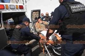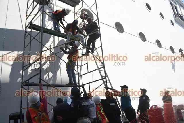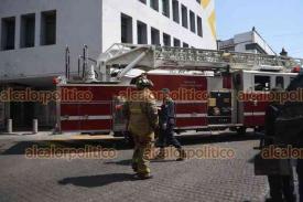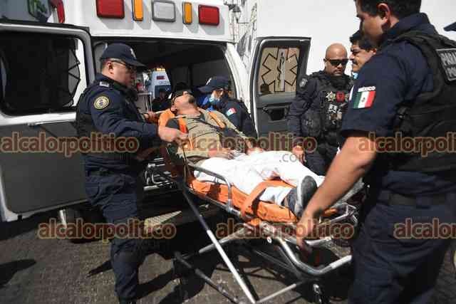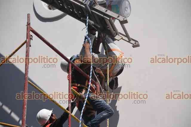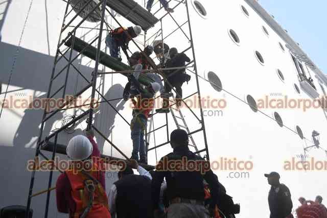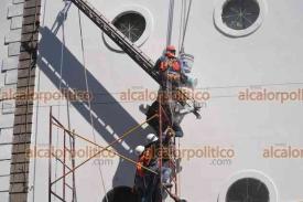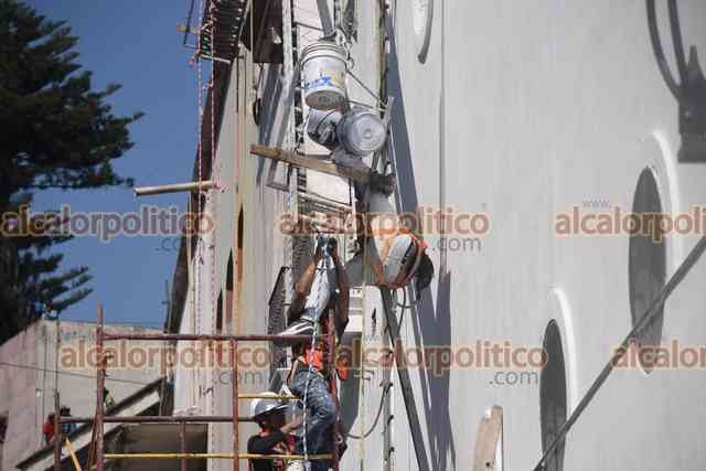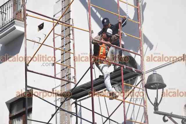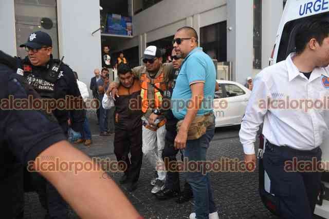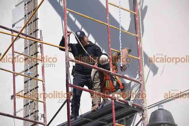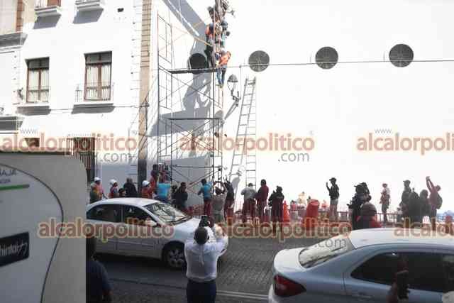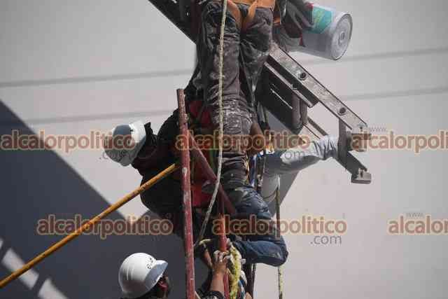 Xalapa, Ver., 13 de febrero de 2025.- Uno de los trabajadores que están pintando el Palacio de Gobierno quedó colgado tras desprenderse parte de un andamio. Fue auxiliado por compañeros, bomberos y policías para luego ser trasladado a un hospital para su valoración.