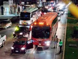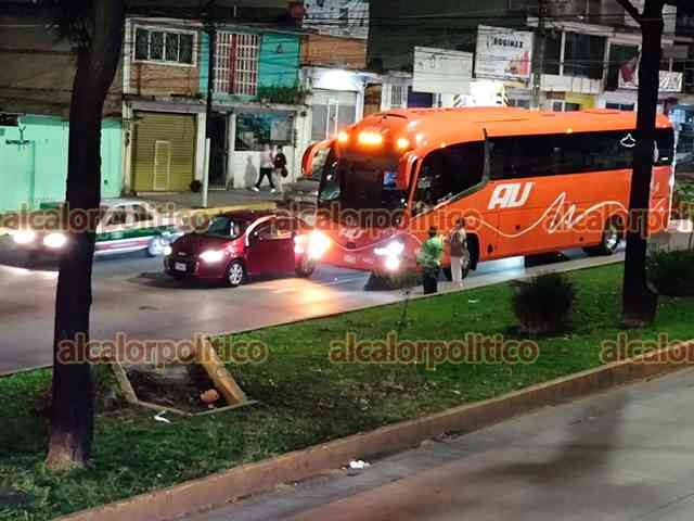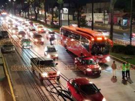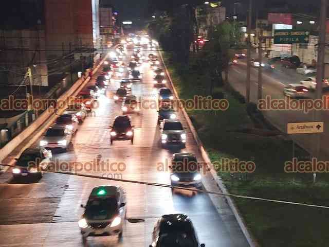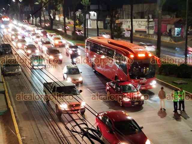 Xalapa, Ver., 14 de febrero de 2025.- Colapsado Lázaro Cárdenas por accidentes, la noche de este viernes. En el carril de Tesorería a Las Trancas, a la altura del puente peatonal Antonio M. Quirasco, motociclista fue embestido por auto y resultó lesionado. Metros adelante, autobús AU colisionó con un automóvil, sólo hubo daños materiales.