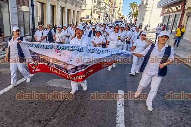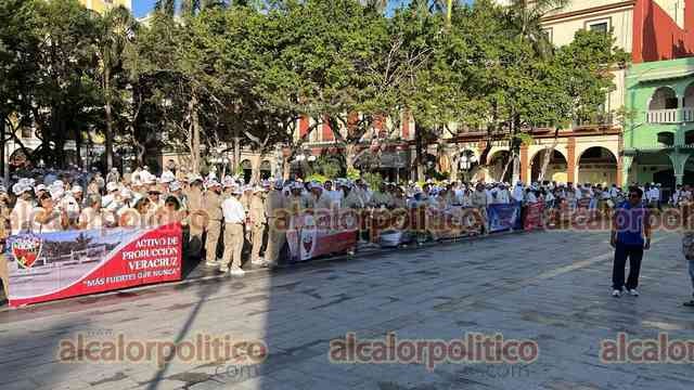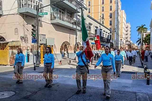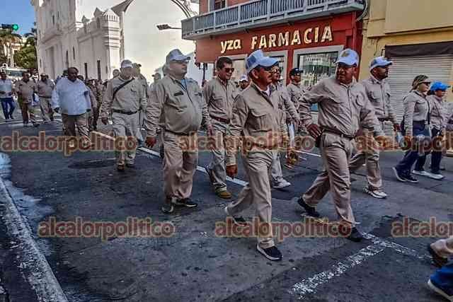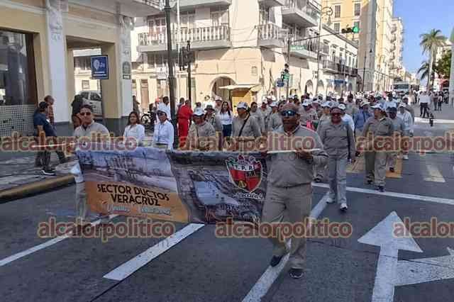 Veracruz, Ver., 18 de marzo de 2025.- Trabajadores de PEMEX desfilaron por calles del Centro para conmemorar el 87 aniversario de la Expropiación Petrolera. El cierre de vialidades provocó caos vial.