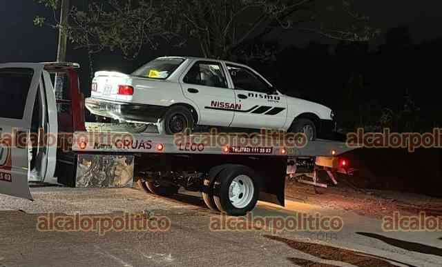 Poza Rica, Ver., 24 de abril de 2025.- Por una aparente confusión, sicarios que atacaron al reportero de “Presente Veracruz Oficial” dispararon contra un Tsuru similar (que se observa sobre una grúa) al que usa el periodista (estacionado junto a una patrulla).
