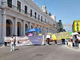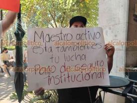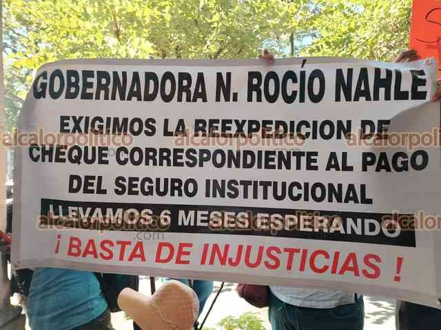 Xalapa, Ver., 15 de mayo de 2025.- Docentes jubilados bloquearon la calle Enríquez, en el centro de la Capital. Exigen al Gobierno Estatal el pago del seguro institucional.