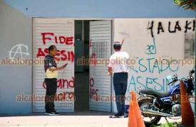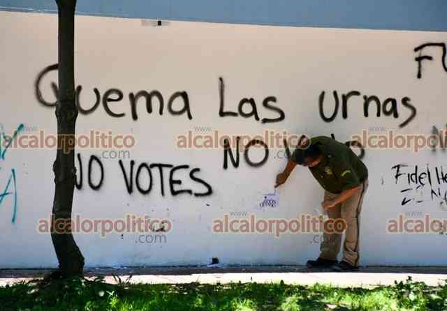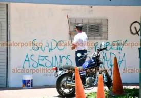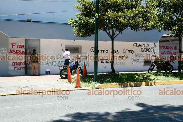 Xalapa, Ver., 15 de mayo de 2025.- Luego del vandalismo de anarquistas, trabajadores se pusieron a pintar la fachada del INE.