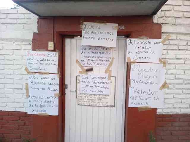 Xalapa, Ver., 20 de mayo de 2025.- “Alumnos con celular en horas de clase”, “Maestras flojean platicando”, son algunas de las leyendas escritas en los carteles colocados en la entrada de la Telesecundaria “Ángel Hermida”.
