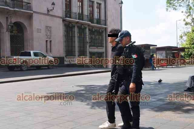 Xalapa, Ver., 21 de mayo de 2025.- Policías estatales detuvieron a un joven en el parque Juárez porque presuntamente llevaba droga en su mochila.