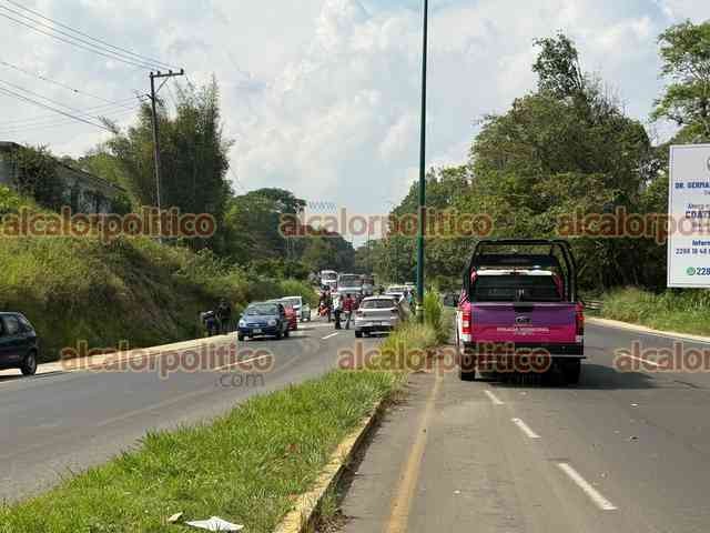Xalapa, Ver., 22 de mayo de 2025.- Vehículo chocó contra un poste de alumbrado público y lo tiró, en la carretera Xalapa-Coatepec. Elementos de Tránsito arribaron al lugar para llevar a cabo las diligencias por el percance.
