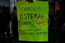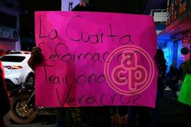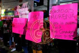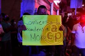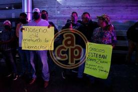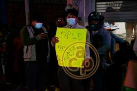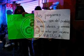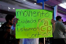 Xalapa, Ver., 6 de junio de 2025.- Simpatizantes de Movimiento Ciudadano, procedentes de diversos municipios, que exhiben pancartas con frases agresivas, se manifestaron esta noche de viernes frente a las bodegas del OPLE, en la calle Clavijero, cerca de la calle Isauro Acosta.